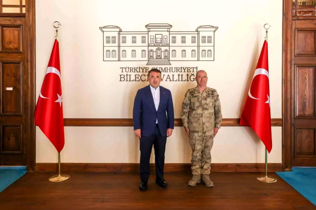 Bilecik Jandarma Eğitim Komutanlığı görevine atanan Tuğgeneral Yusuf Aslan ile Bilecik İl Jandarma Komutanlığı görevine başlayan Jandarma Kıdemli Albay Ali Vanlı, Vali Faik Oktay Sözer’i ziyaret etti. Komutanlarla bir süre görüşen Vali Sözer, Bilecik’in güvenliği ve huzuru için yapılan çalışmalarda koordinasyonun önemine değindi. Valilik makamında gerçekleşen kabulde Vali Sözer, yeni görevlerine başlayan komutanlara ‘hayırlı olsun’ temennisinde bulunarak başarılar diledi. – BİLECİK