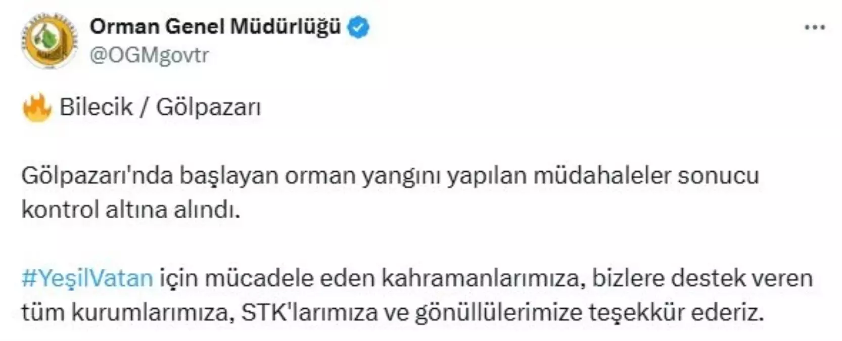 OGM’nin sosyal medya hesabından yapılan açıklamada, “Bilecik Gölpazarı’nda başlayan orman yangını yapılan müdahaleler sonucu kontrol altına alındı. Yeşil vatan için mücadele eden kahramanlarımıza, bizlere destek veren tüm kurumlarımıza, sivil toplum kuruluşlarımıza ve gönüllülerimize teşekkür ederiz” ifadelerine yer verildi.