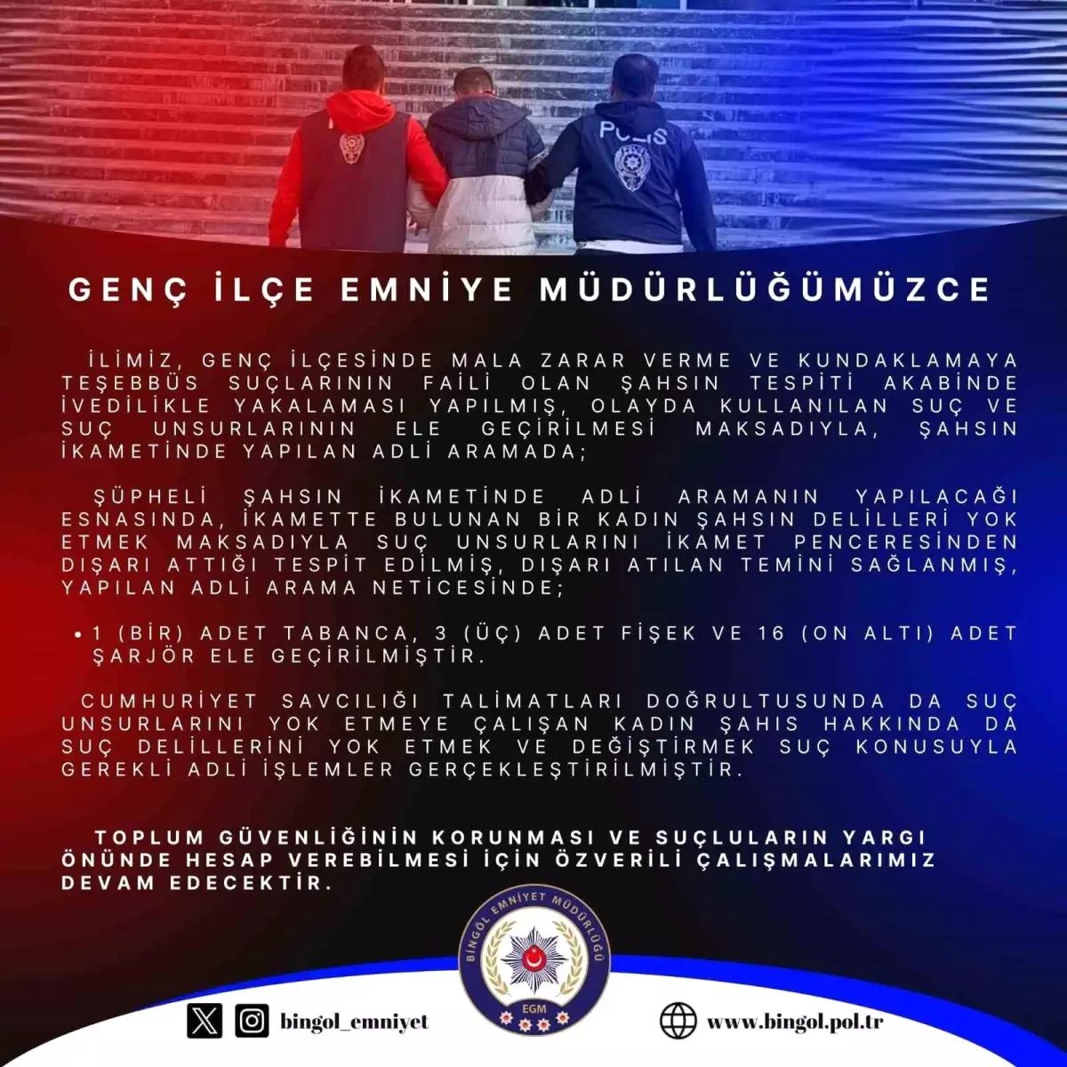 Bingöl İl Emniyet Müdürlüğü’nden yapılan açıklamada, “Genç İlçe Emniyet Müdürlüğümüzce ilimiz, Genç ilçesinde mala zarar verme ve kundaklamaya teşebbüs suçlarının faili olan şahsın tespiti akabinde ivedilikle yakalaması yapılmış, olayda kullanılan suç ve suç unsurlarının ele geçirilmesi maksadıyla, şahsın ikametinde yapılan adli aramada; şüpheli şahsın ikametinde adli aramanın yapılacağı esnasında, ikamette bulunan bir kadın şahsın delilleri yok etmek maksadıyla suç unsurlarını ikamet penceresinden dışarı attığı tespit edilmiş, dışarı atılan temini sağlanmış, yapılan adli arama neticesinde 1 adet tabanca, 3 adet fişek ve 16 adet şarjör ele geçirildi. Cumhuriyet savcılığı talimatları doğrultusunda da suç unsurlarını yok etmeye çalışan kadın şahıs hakkında da suç delillerini yok etmek ve değiştirmek suç konusuyla gerekli adli işlemler gerçekleştirilmiştir” denildi. – BİNGÖL