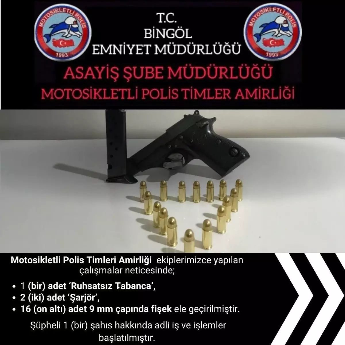 Bingöl Emniyet Müdürlüğü Motosikletli Polis Timleri Amirliğince yapılan çalışmalar kapsamında 1 adet ruhsatsız tabanca, 2 adet şarjör, 16 adet 9 milimetre çapında fişek ele geçirildi. Şüpheli şahıs hakkında adli işlem başlatıldı. – BİNGÖL