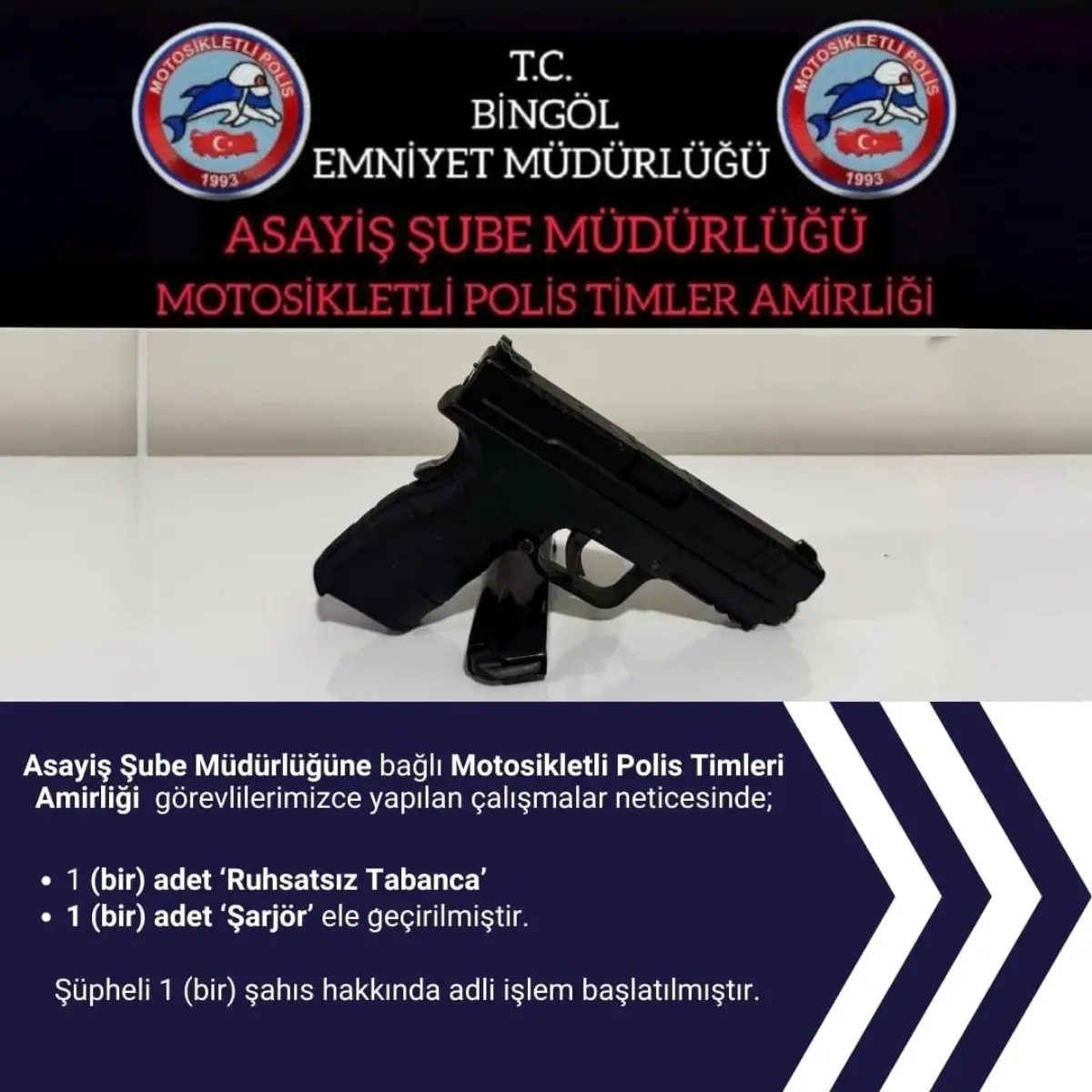 Bingöl İl Emniyet Müdürlüğü, kent genelinde huzur ve güven için çalışmalarını aralıksız sürdürüyor. Bu çerçevede Asayiş Şube Müdürlüğü’ne bağlı motosikletli polis timleri tarafından yapılan çalışmada, 1 adet ruhsatsız tabanca ve şarjör ele geçirildi. Şüpheli hakkında adli işlem başlatıldığı bildirildi. – BİNGÖL