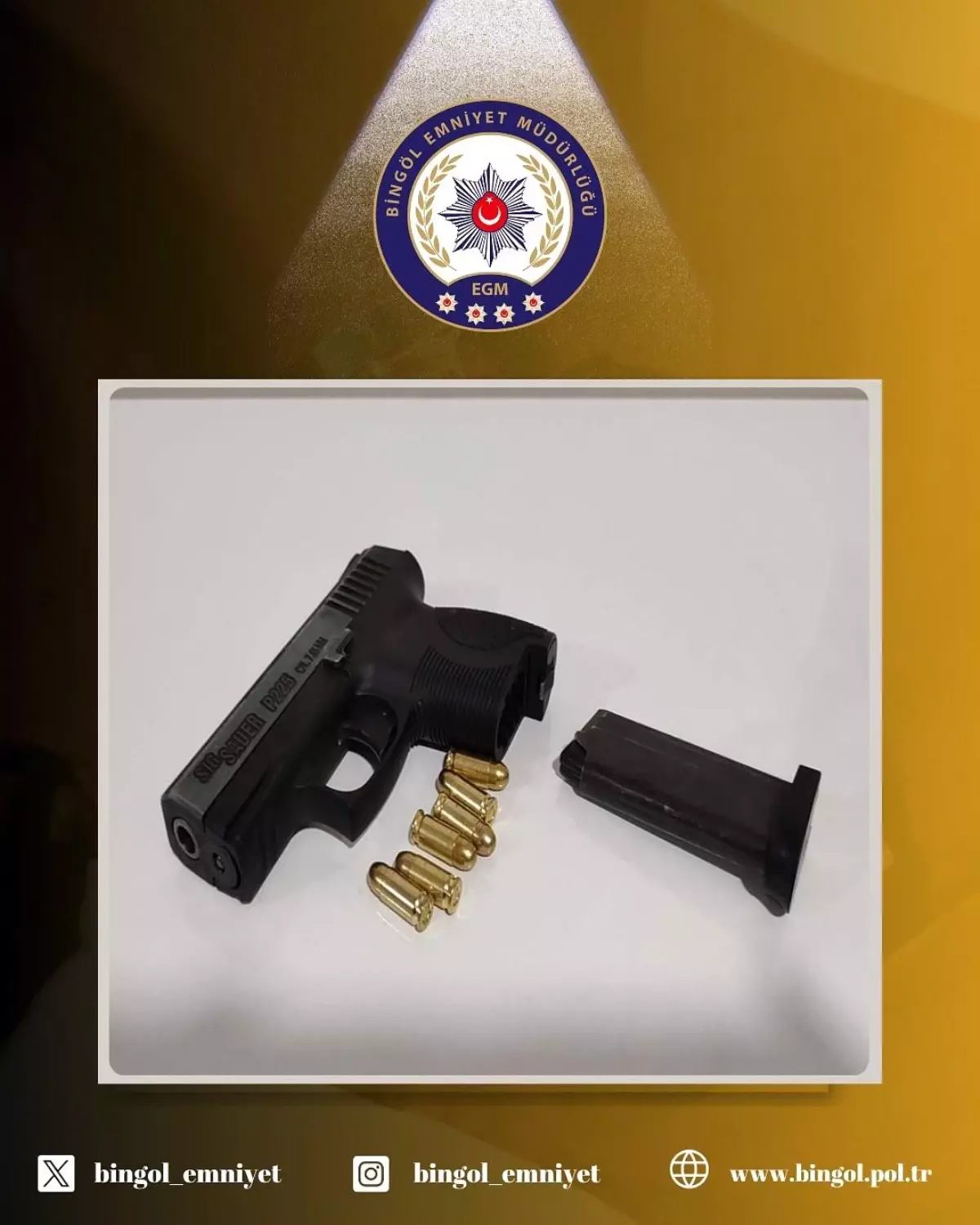 Bingöl’de polis ekiplerince bir araçta yapılan aramada ruhsatsız tabanca ve fişek ele geçirildi.