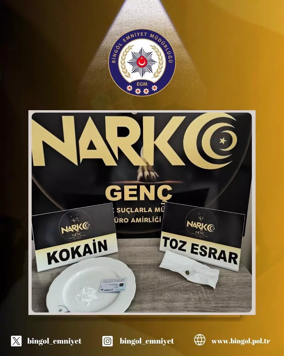 Bingöl İl Emniyet Müdürlüğü’nden yapılan açıklamada, “Bingöl Narkotik Suçlarla Mücadele Şube Müdürlüğü Genç Büro Amirliği ekiplerince; 3 şüpheli şahsın üzerinden 0.71 gram kokain maddesi, 3.00 gram toz esrar maddesi ele geçirildi. Şüpheli şahıslara adli işlem başlatılmıştır” denildi. – BİNGÖL