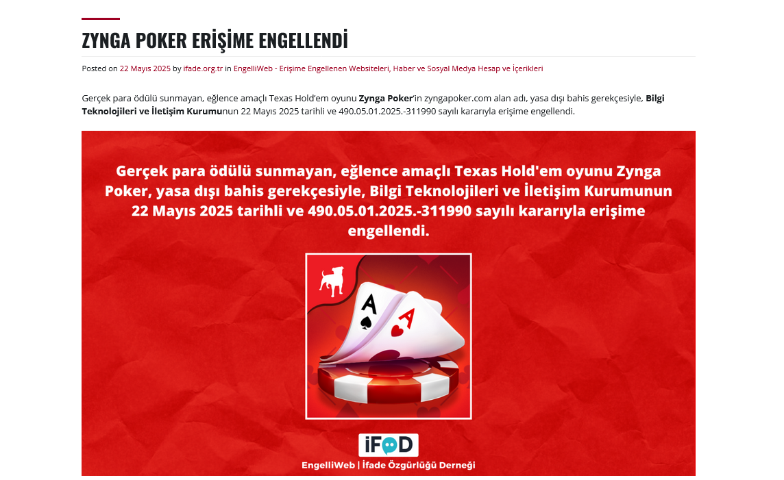 Bilgi Teknolojileri ve İletişim Kurumu (BTK), dün (22 Mayıs) 490.05.01.2025.-311990 sayılı kararı ile zyngapoker.com’a erişim engeli getirdi. Engel, yasa dışı bahis iddiasıyla geldi.