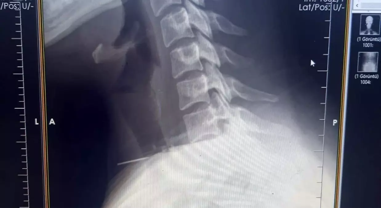 Radyolojik incelemeler ve klinik değerlendirmeler sonucunda, 3 santimetrelik iğnenin boğaz bölgesinin derinliklerine doğru ilerlediği tespit edildi.