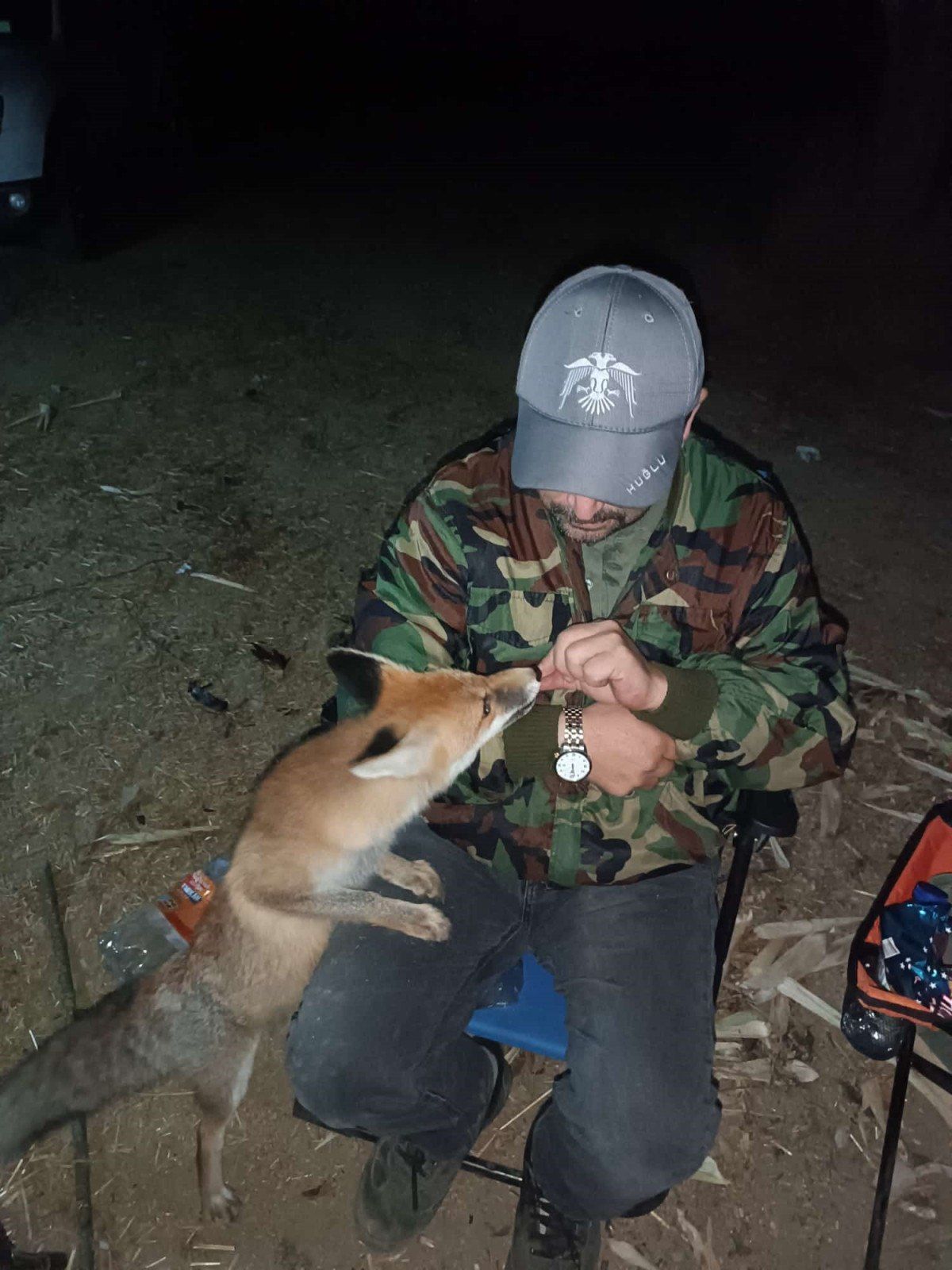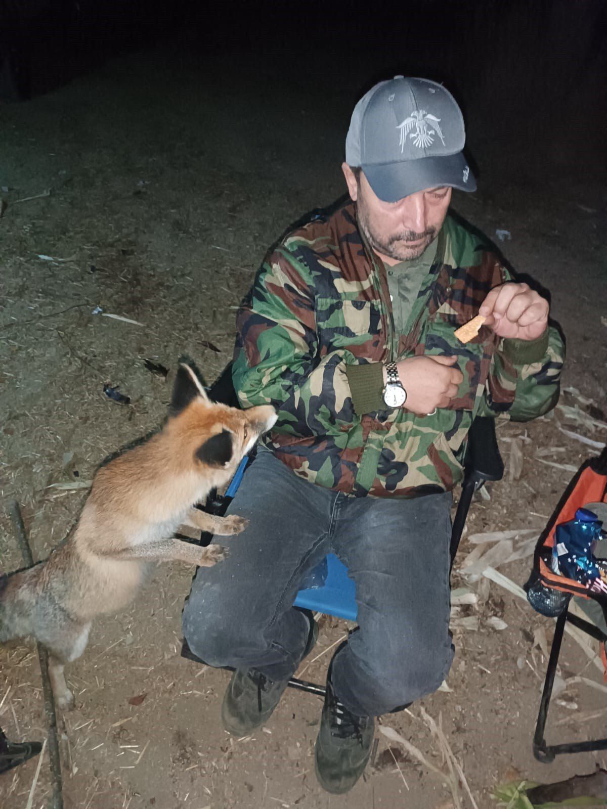 Mudurnu Avcılar Derneği Başkanı Murat Yavuz da,çiftçilere destek amacıyla mısır tarlalarında gece nöbeti tutarken yanına bir tilki geldi.