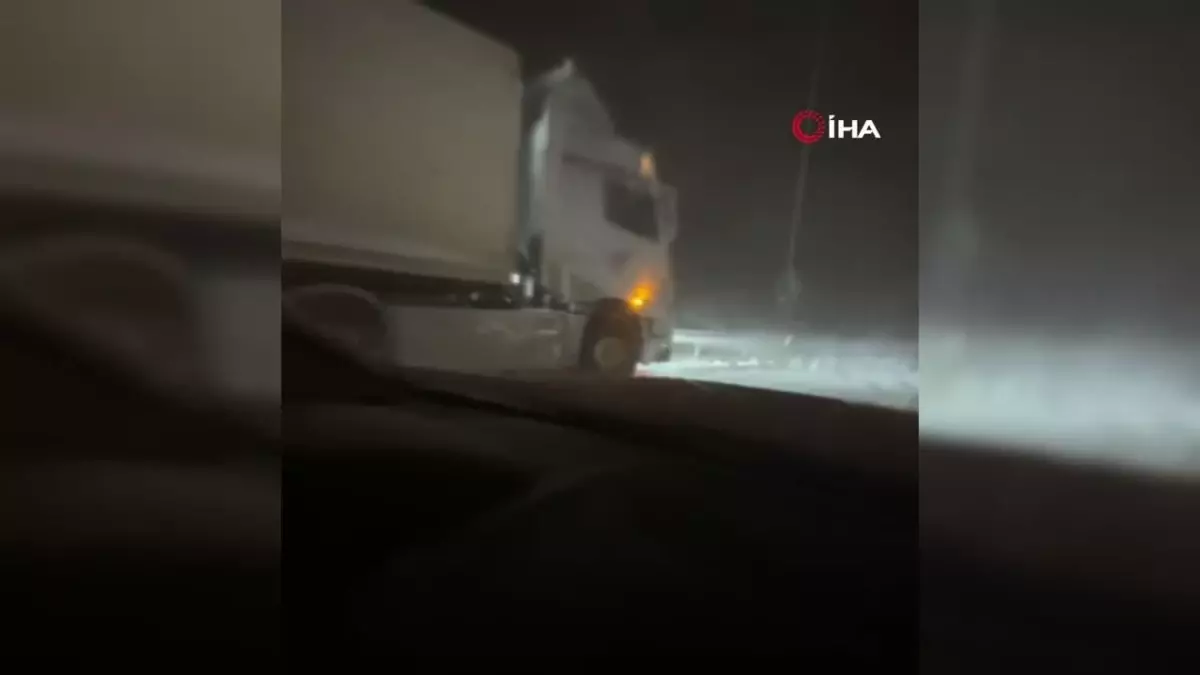 Kar nedeniyle yolda kalan tırlar emniyet şeridine alındı, trafik yeniden açılmaya başladı.