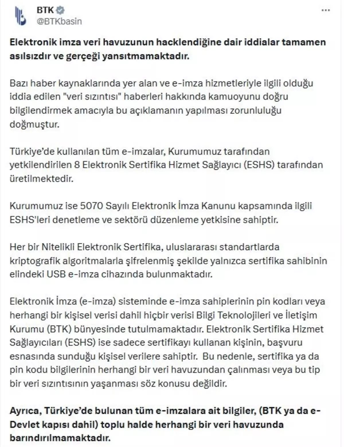 BTK’nın sosyal medya hesabından yapılan açıklamada, elektronik imza veri havuzunun hacklendiğine dair iddiaların tamamen asılsız olduğu belirtilerek, “Bazı haber kaynaklarında yer alan ve e-imza hizmetleriyle ilgili olduğu iddia edilen veri sızıntısı haberleri hakkında kamuoyunu doğru bilgilendirmek amacıyla bu açıklamanın yapılması zorunluluğu doğmuştur. Türkiye’de kullanılan tüm e-imzalar, kurumumuz tarafından yetkilendirilen 8 elektronik sertifika hizmet sağlayıcı (ESHS) tarafından üretilmektedir. Kurumumuz ise 5070 Sayılı Elektronik İmza Kanunu kapsamında ilgili ESHS’leri denetleme ve sektörü düzenleme yetkisine sahiptir. Her bir nitelikli elektronik sertifika, uluslararası standartlarda kriptografik algoritmalarla şifrelenmiş şekilde yalnızca sertifika sahibinin elindeki USB e-imza cihazında bulunmaktadır. E-imza sisteminde, e-imza sahiplerinin pin kodları veya herhangi bir kişisel verisi dahil hiçbir verisi Bilgi Teknolojileri ve İletişim Kurumu (BTK) bünyesinde tutulmamaktadır. Elektronik sertifika hizmet sağlayıcıları ise sadece sertifikayı kullanan kişinin, başvuru esnasında sunduğu kişisel verilere sahiptir. Bu nedenle, sertifika ya da pin kodu bilgilerinin herhangi bir veri havuzundan çalınması veya bu tip bir veri sızıntısının yaşanması söz konusu değildir” ifadelerine yer verildi.