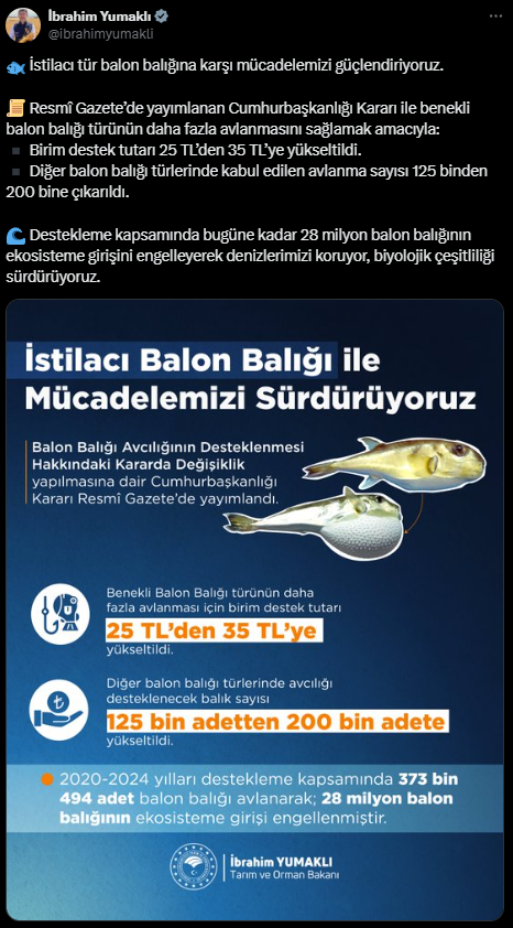 Bakan Yumaklı, sosyal medya hesabından yaptığı açıklamada, düzenlemeyle birlikte Lagocephalus Sceleratus türü balon balığı için 100 bin adede kadar tane başına 35 lira diğer türleri için de 200 bin adede kadar tanesi için 10 lira ödeneceğini belirtti. Söz konusu destekleme kararı, Resmî Gazete’de de yayımlandı.