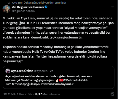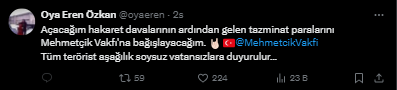 Tartışmaların büyümesi üzerine TRT spikeri Oya Eren Özkan sosyal medya hesabından açıklama yaptı. Hakaret davaları açacağını belirten Özkan, kazanılacak tazminatları Mehmetçik Vakfı’na bağışlayacağını söyledi.