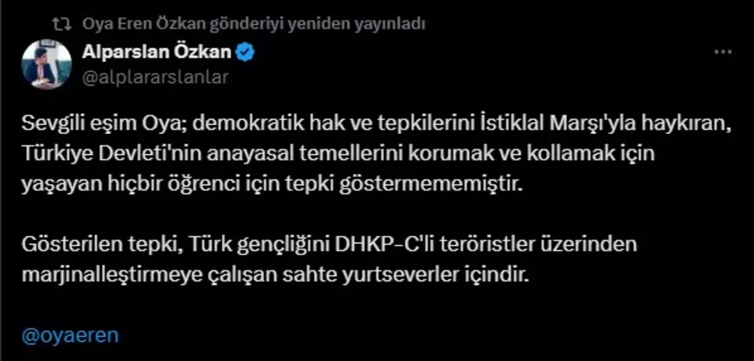 Eşi Alparslan Özkan da sosyal medyada eşine destek verdi. Açıklamasında, “Tepki, Türk gençliğini DHKP-C üzerinden marjinalleştirmeye çalışan sahte yurtseverlere yöneliktir” dedi.