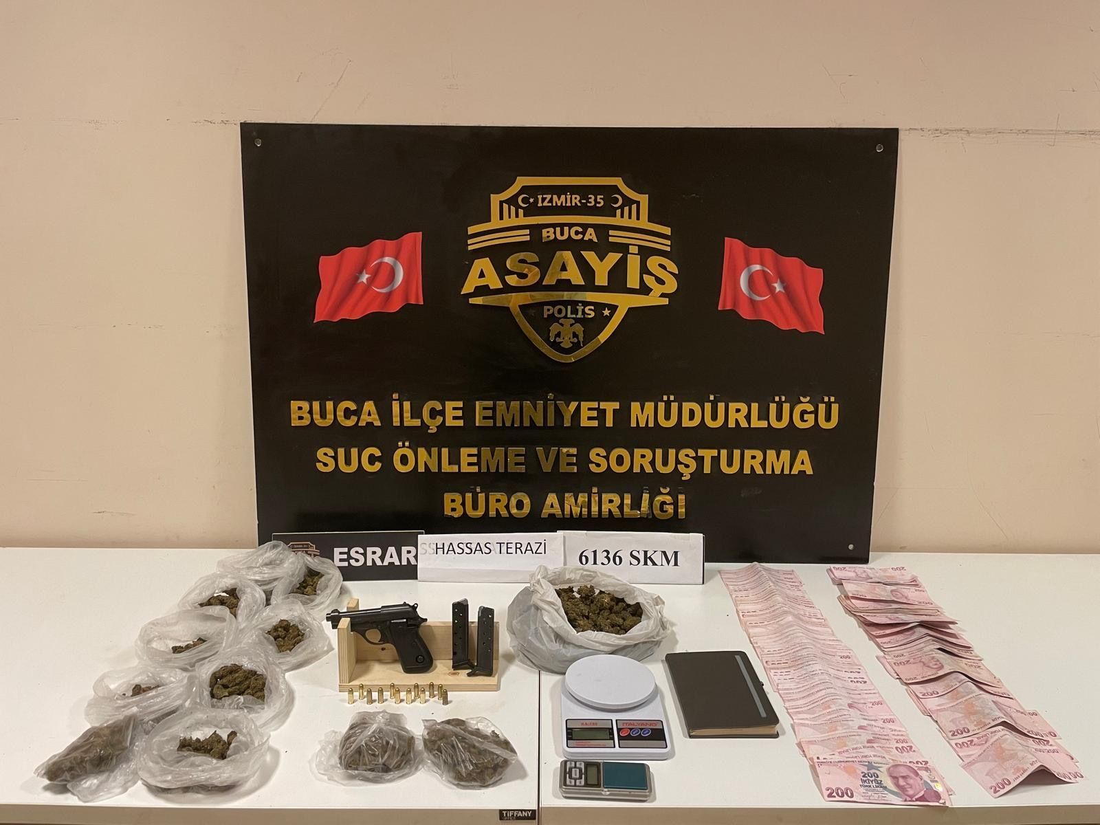 İzmir İl Emniyet Müdürlüğü’ne bağlı Buca İlçe Emniyet Müdürlüğü ekipleri, toplum sağlığını ve kamu düzenini tehdit eden uyuşturucu madde ticareti ile bireysel silahlanmaya karşı yürüttükleri çalışmalar kapsamında önemli bir operasyona daha imza attı.