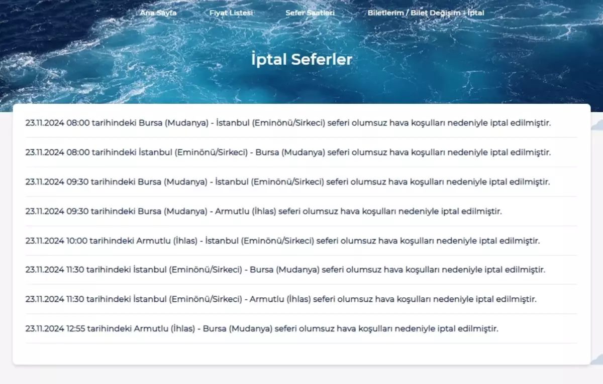 BUDO’dan yapılan duyuruda, 08.00 ile 12.55 saatleri arasında yapılması planlanan Bursa (Mudanya) – İstanbul (Eminönü/Sirkeci), İstanbul (Eminönü/Sirkeci) – Bursa (Mudanya), Bursa (Mudanya) – İstanbul (Eminönü/Sirkeci), Bursa (Mudanya) – Armutlu (İhlas), Armutlu (İhlas) – İstanbul (Eminönü/Sirkeci),İstanbul (Eminönü/Sirkeci) – Bursa (Mudanya), İstanbul (Eminönü/Sirkeci) – Armutlu (İhlas), Armutlu (İhlas) – Bursa (Mudanya) olmak üzere karşılıklı 8 deniz otobüsü seferinin iptal edildiği belirtildi.