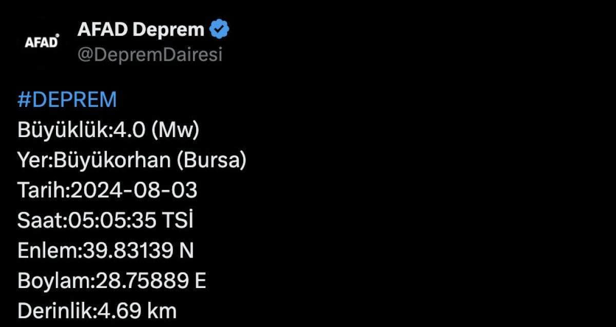 Bursa’nın Büyükorhan ilçesinde saat 05.05’te 4 büyüklüğünde deprem oldu.