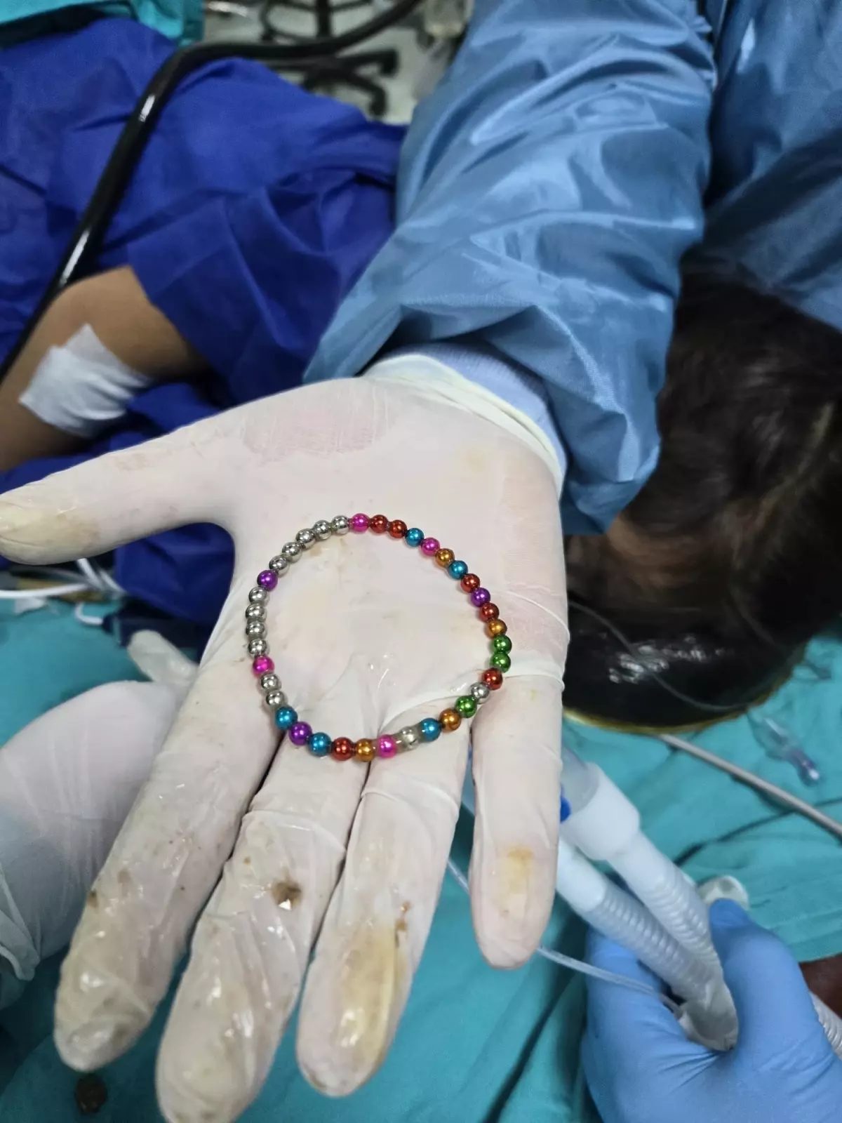 BURSA’da, E.E. (5) isimli kız çocuğu, oyun oynadığı mıknatıslı boncuk bilekliği yuttu. Acil operasyona alınan çocuğun bağırsağından 38 adet mıknatıslı boncuk çıkarıldı.