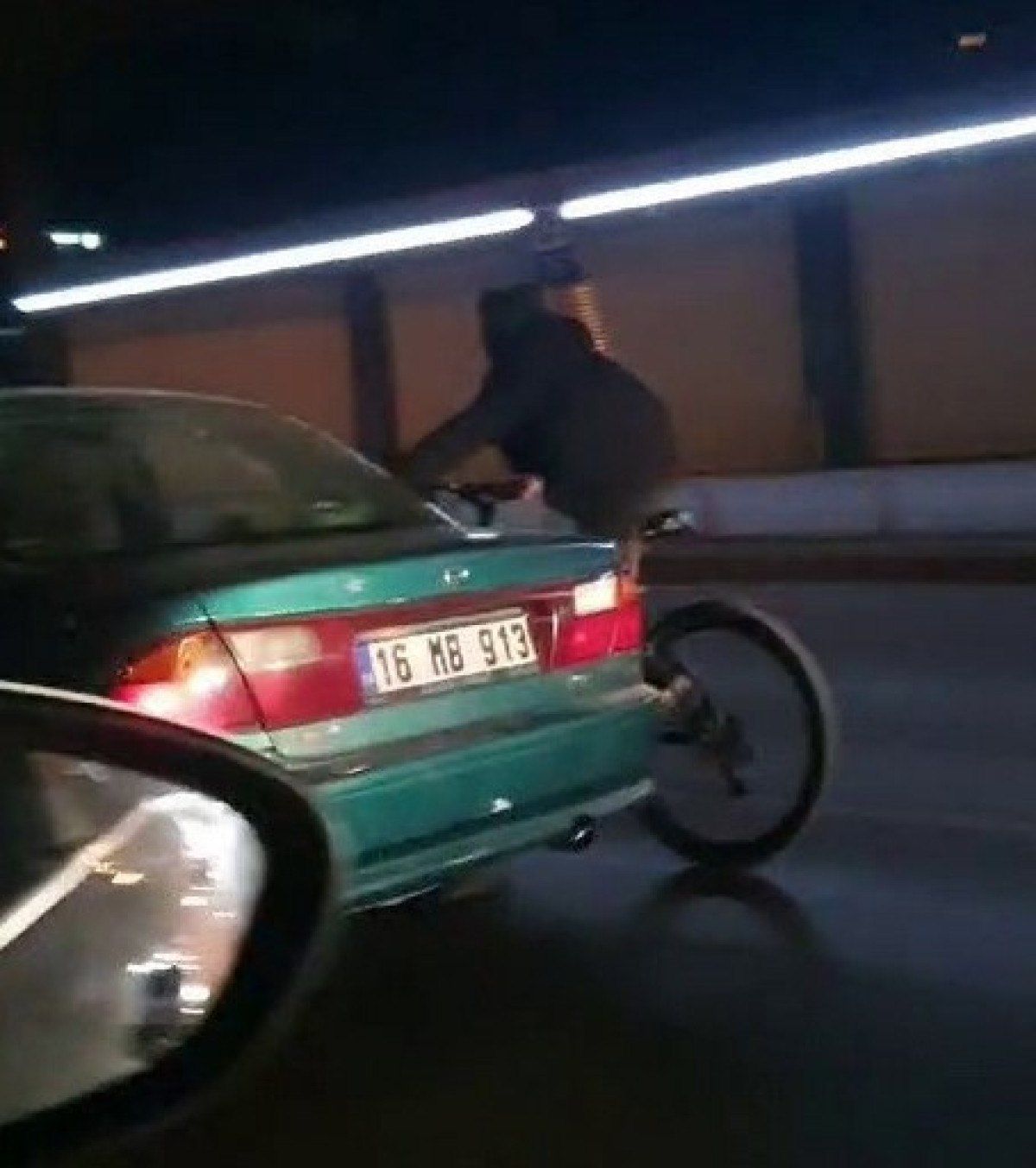 Yıldırım ilçesi Ankara Yolu Caddesi üzerinde, Mimar Sinan metro istasyonu yakınlarında, bir bisiklet sürücüsü seyir halindeki 16 MB plakalı otomobile tutunarak yol aldı.