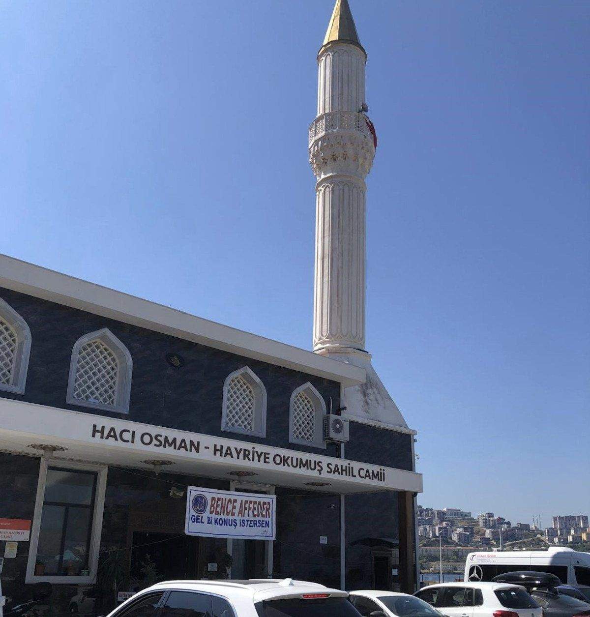 Sahil Camii’nin din görevlisi kapıya astığı afişte, “Bence affeder, gel bir konuş istersen.” sözleri yer aldı.