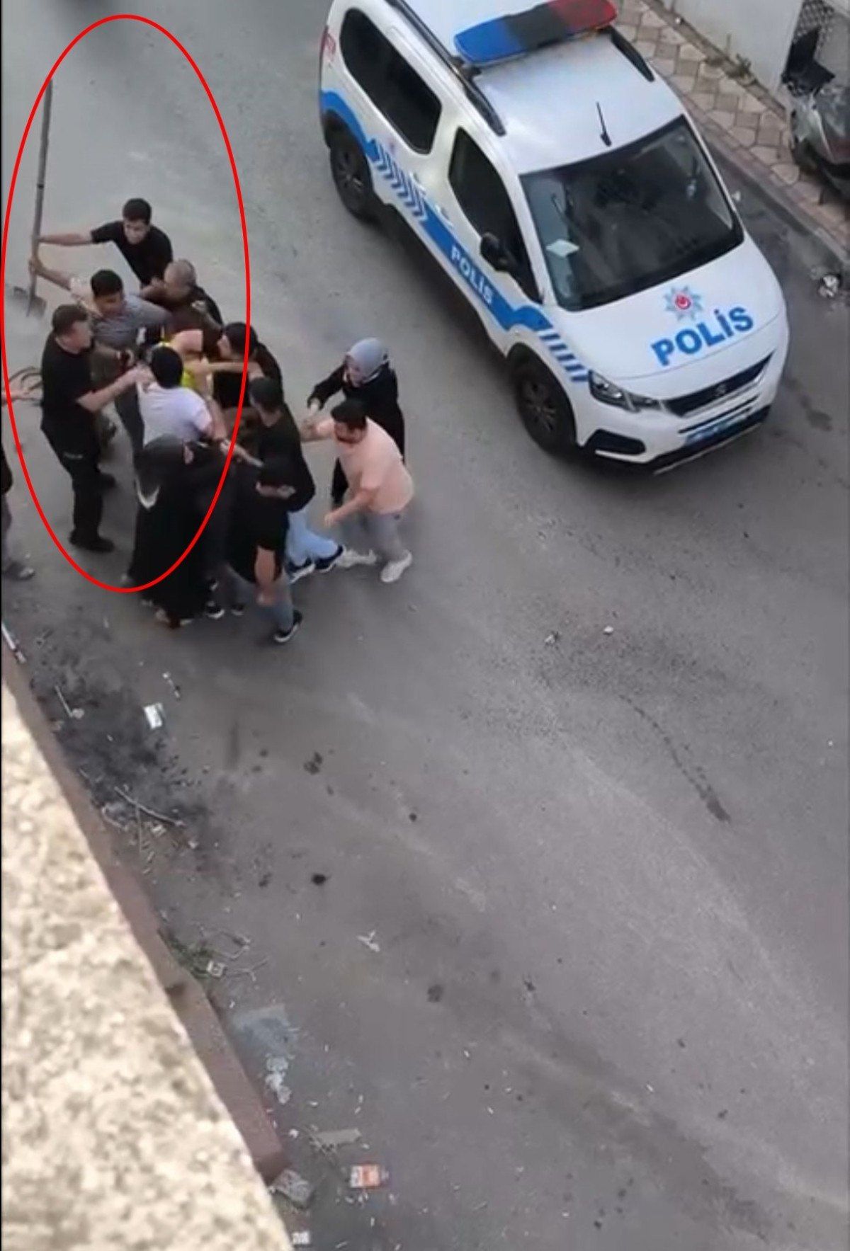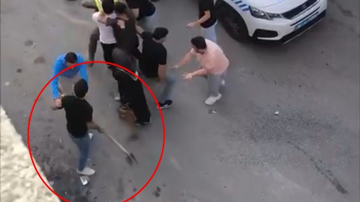 Tekme ve yumruklarla birbirine vuran kalabalıkta bir kişi, eline aldığı kürekle karşı tarafa saldırdı.