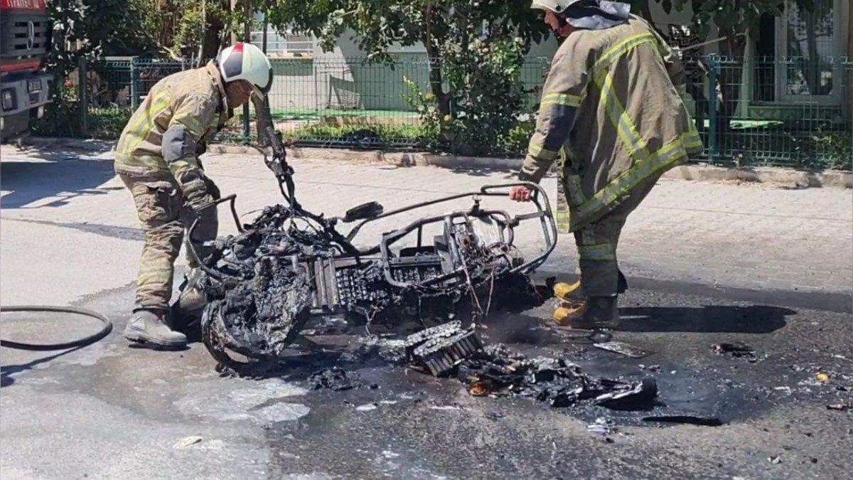 İhbarla adrese gelen itfaiye ekipleri, elektrikli bisikletteki yangını söndürdü. Elektrikli bisiklet kullanılamaz hale gelirken, olay anı bir iş yerine ait güvenlik kamerası tarafından görüntülendi.