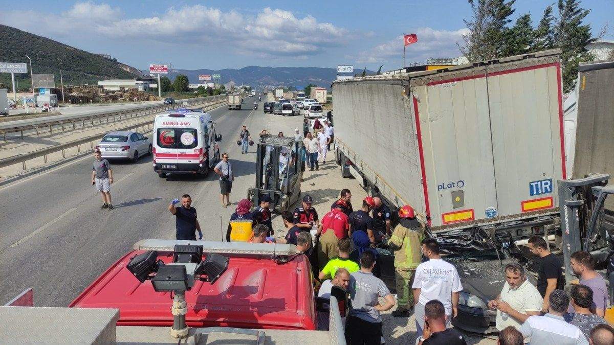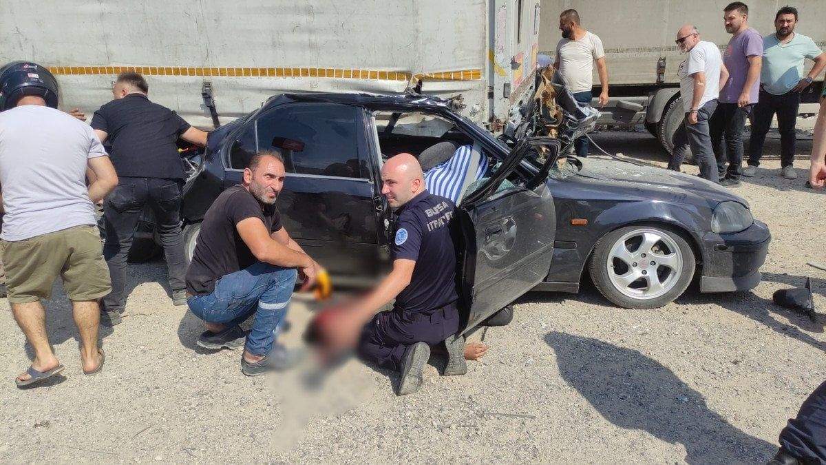 Savrulan otomobil, yol kenarında park halinde olan 16 BIS 22 plakalı tırın dorsesinin altına girdi. İhbarla olay yerine itfaiye, polis ve sağlık ekipleri sevk edildi.