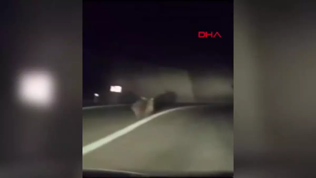 Nilüfer ilçesi Gümüştepe Mahallesi mevkisinde dün gece saatlerinde 2 arkadaş otomobille gezerken, aniden yola ayı çıktı. Bir süre aracın önünde yolda gezinen ayı, daha sonra ağaçların arasına girerek gözden kayboldu. Otomobildekiler, o anları cep telefonu kamerasıyla görüntüledi.