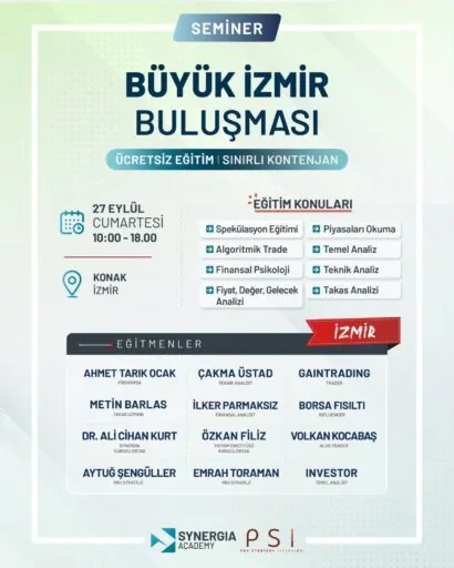 İzmir, 27 Eylül Cumartesi günü yatırım dünyasının önde gelen uzmanlarını ağırlayacak. Konak’ta düzenlenecek “Büyük İzmir Yatırımcı Buluşması” kapsamında, spekülasyon eğitiminden algoritmik trade ve teknik analize; piyasa okuma ve takas analizinden temel analize; finansal psikolojiden fiyat, değer ve gelecek analizine kadar geniş kapsamlı bir eğitim programı katılımcılara sunulacak.