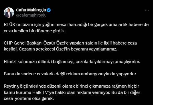 Halk TV Yönetim Kurulu Başkanı Cafer Mahiroğlu, RTÜK tarafından verilen cezaya tepki gösterdi.