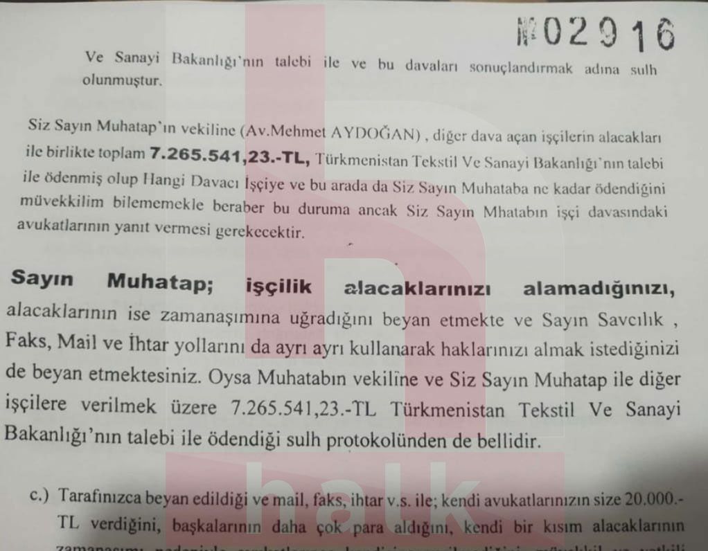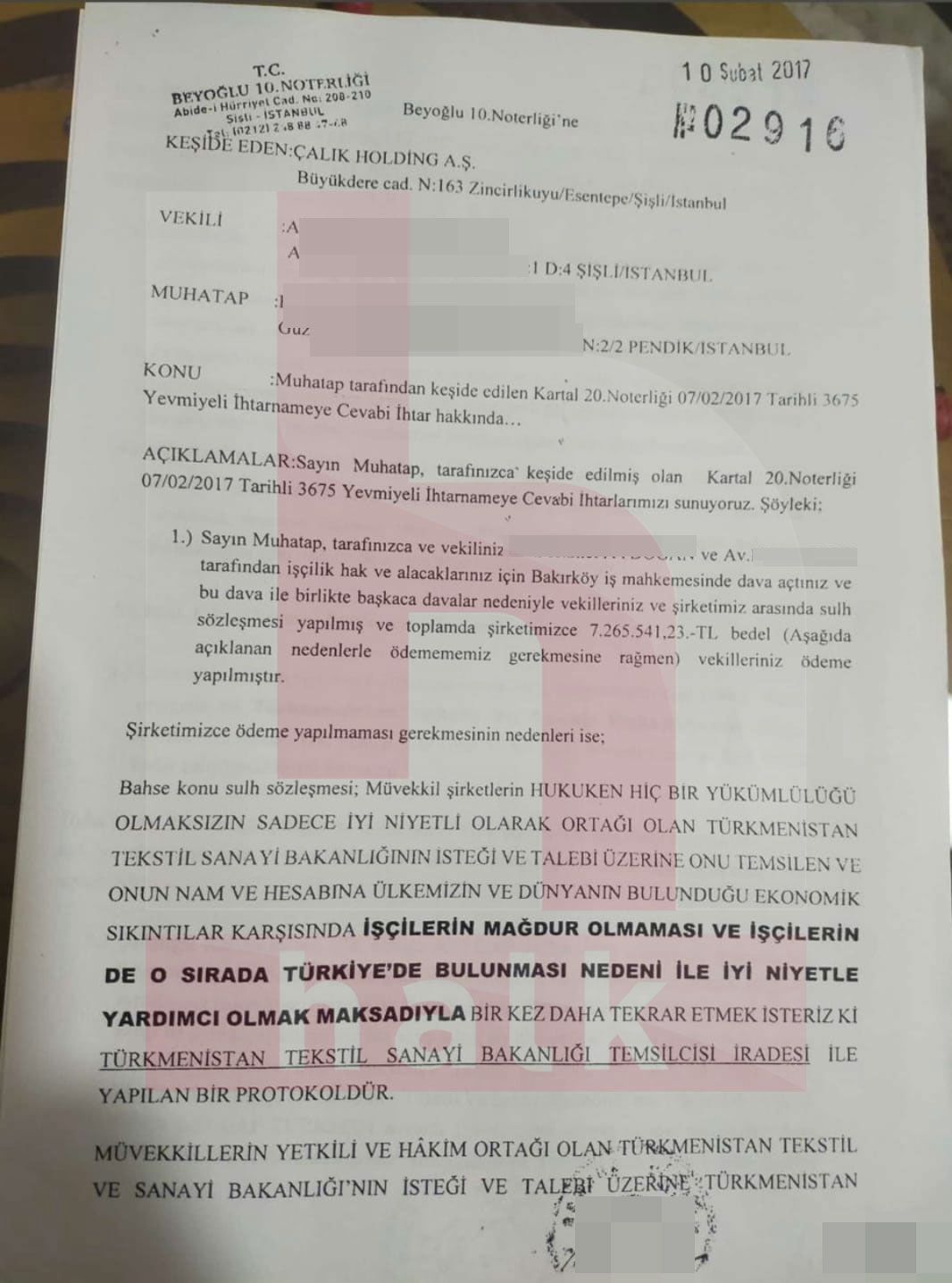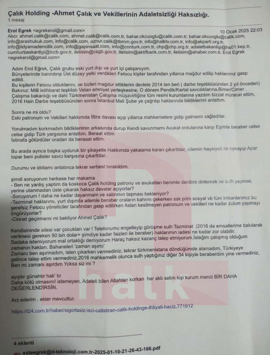 Amcasının 10 yıl önce Çalık Holding’in, Türkmenistan’da kurulu tekstil fabrikasında, elektrik-elektronik teknisyeni olarak çalıştığını söyleyen yeğeni Mehmet Eğrek, amcası ile beraber 30 kişinin iş akdinin hiçbir gerekçe göstermeden feshedildiğini belirtti. Sonrasında dava açıldığını ve 29 kişinin tazminatının ödendiğini ancak amcasının ödenmediğini ifade etti.