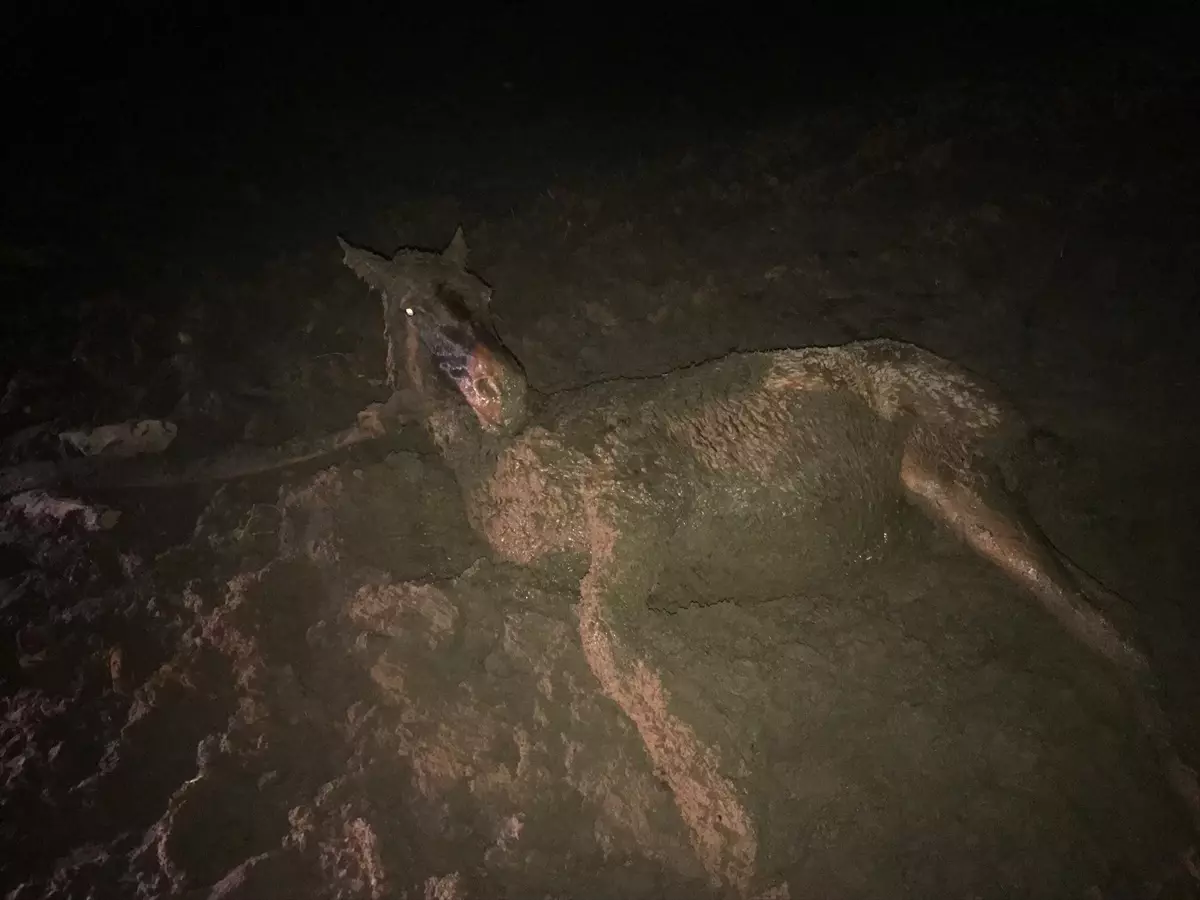 At, ekiplerin ve köylülerin 4 saatlik çalışması sonucu bataklıktan çıkarıldı.