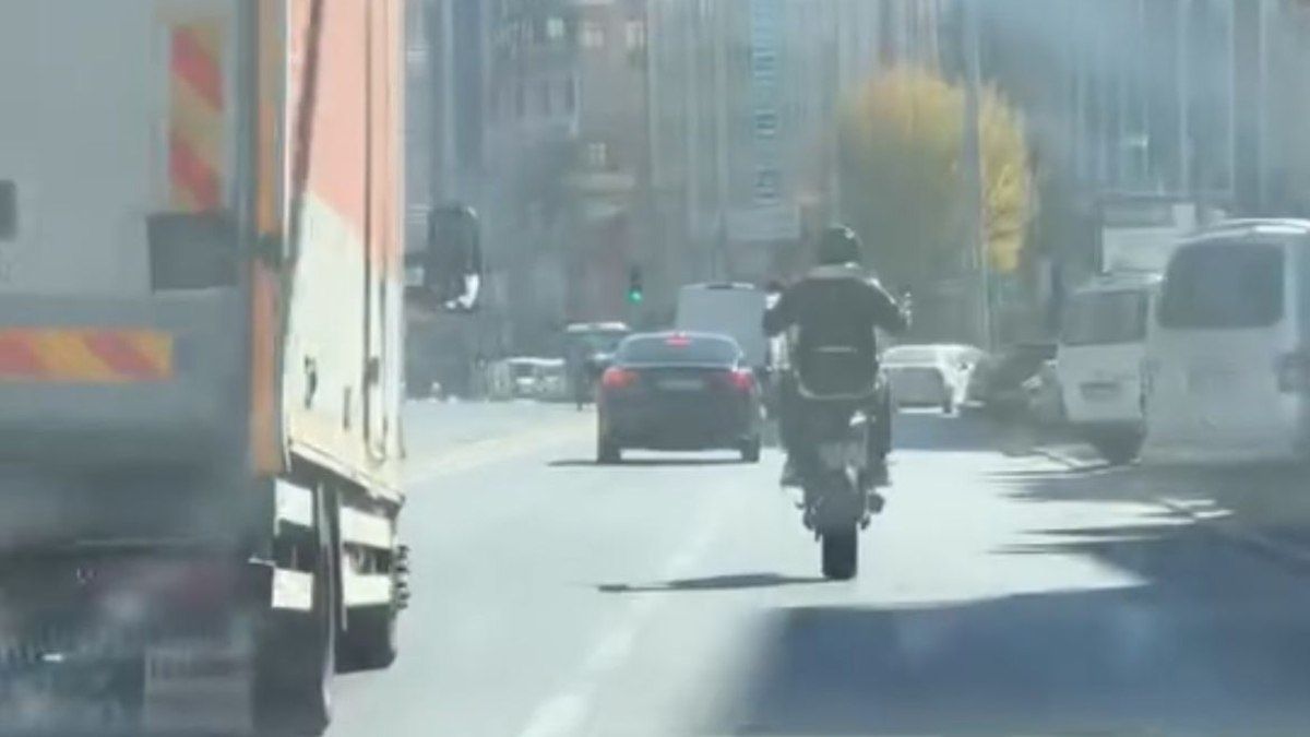 Trafikte seyir halindeyken motosikletinin önünü kaldıran sürücüye 7 bin 819 TL para cezası uygulandı.