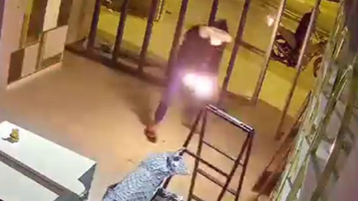 Reyhanlı'da 2 şahsın, motosikletle önüne geldikleri bir mağazayı 3. denemede ateşe verdiği anlar güvenlik kamerasına yansıdı.