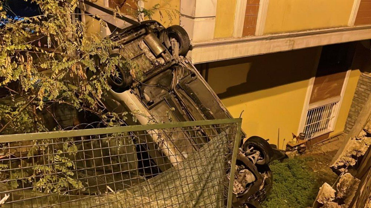 İstanbul Beşiktaş'ta park halindeki hafif ticari araç kayarak binanın önündeki duvarı yıkıp bahçeye uçtu.