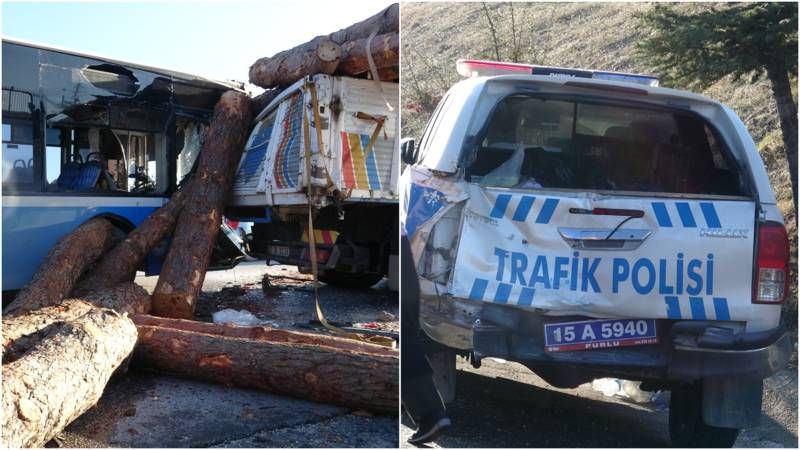 Burdur-Antalya kara yolunda önce polis aracına ardından da tomruk yüklü kamyona çarpan yolcu otobüsünün karıştığı kaza 1'i polis 6 kişi…