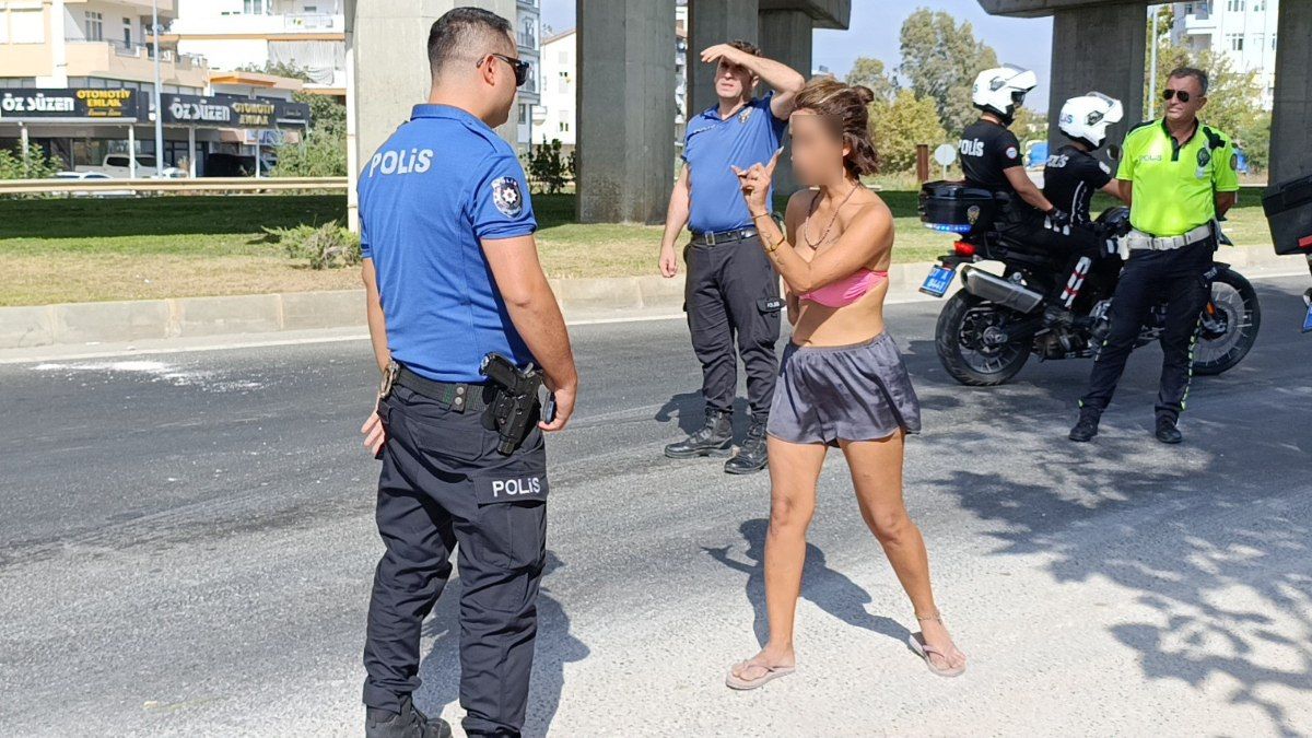 Manavgat ilçesinde üzerinde bikinisi olan genç bir kadının trafiği tehlikeye düşürdüğü ihbarıyla olay yerine gelen ekipler, zor anlar yaşadı.