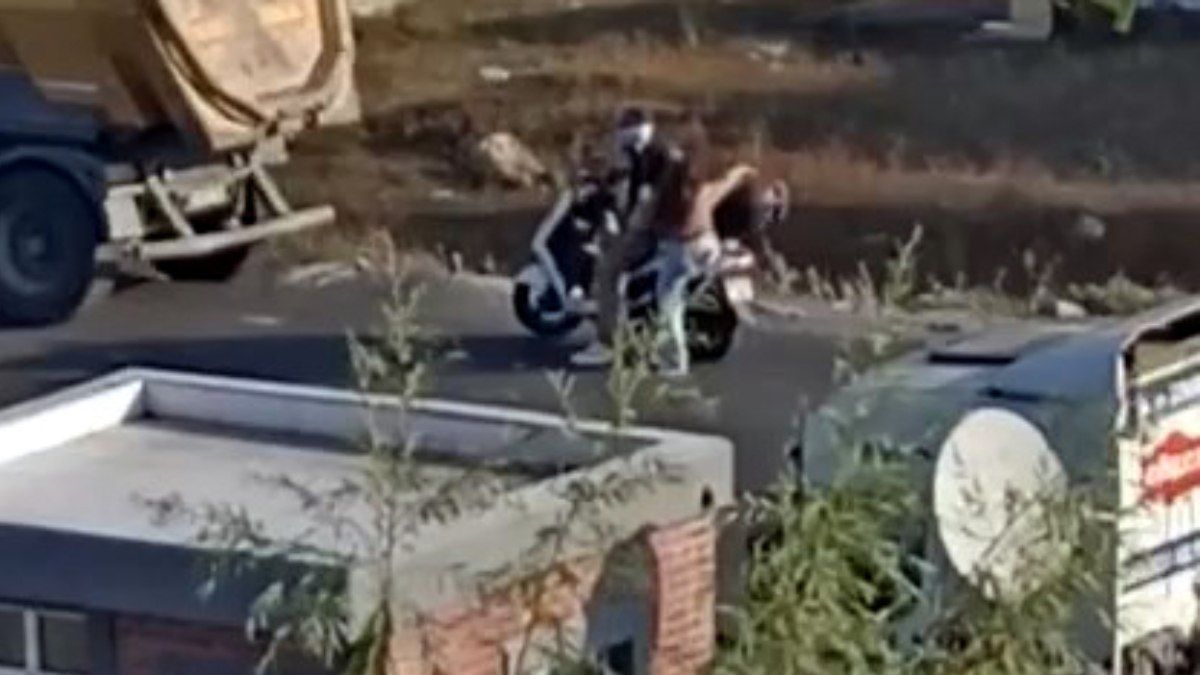 Motosikletli çift, yolun ortasında aracı sürme kavgası yaparken, yol kenarında bulunan araç sürücüsü tarafından kayda alındı.