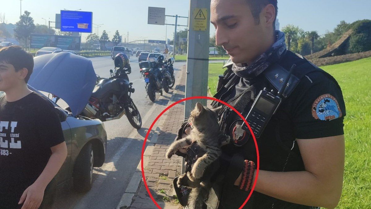 Bursa’da trafiği birbirine katan kediyi polisler kurtardı
