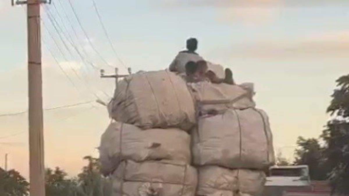 Çeltik ilçesinde dolu kamyonet kasasında yolculuk yapan çocukların, elektrik tellerinin altından geçerken başlarını eğip kaldırdıkları tehlikeli anlar kameraya yansıdı.