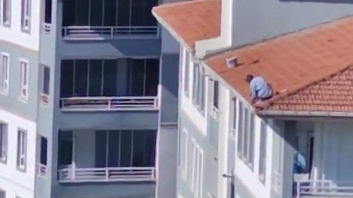 12 katlı binanın çatısında bulunan kişinin güvenlik önlemi almadan çalışması yürekleri ağza getirdi.