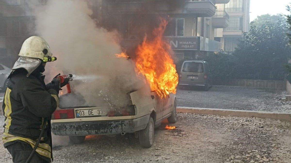 Park halindeki TOFAŞ marka otomobil, motor kısmında çıkan yangın sonrası kısa sürede alevlere teslim olarak hurdaya döndü.