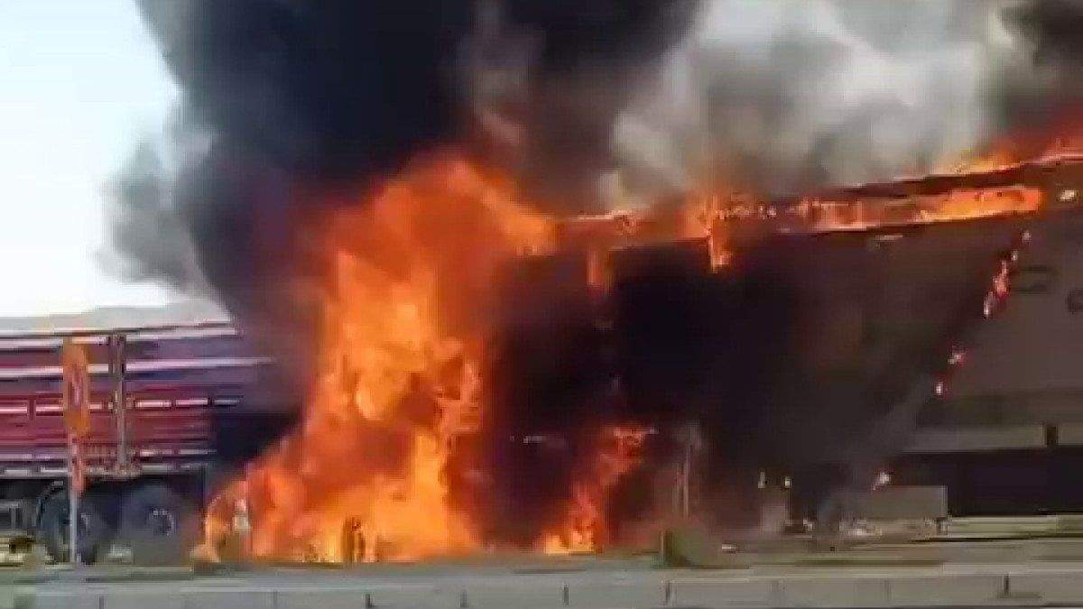D-100 kara yolunda aynı yöne giden başka bir tır ile çarpışan boş LPG deposu yüklü olan tırda çıkan yangın, itfaiye…