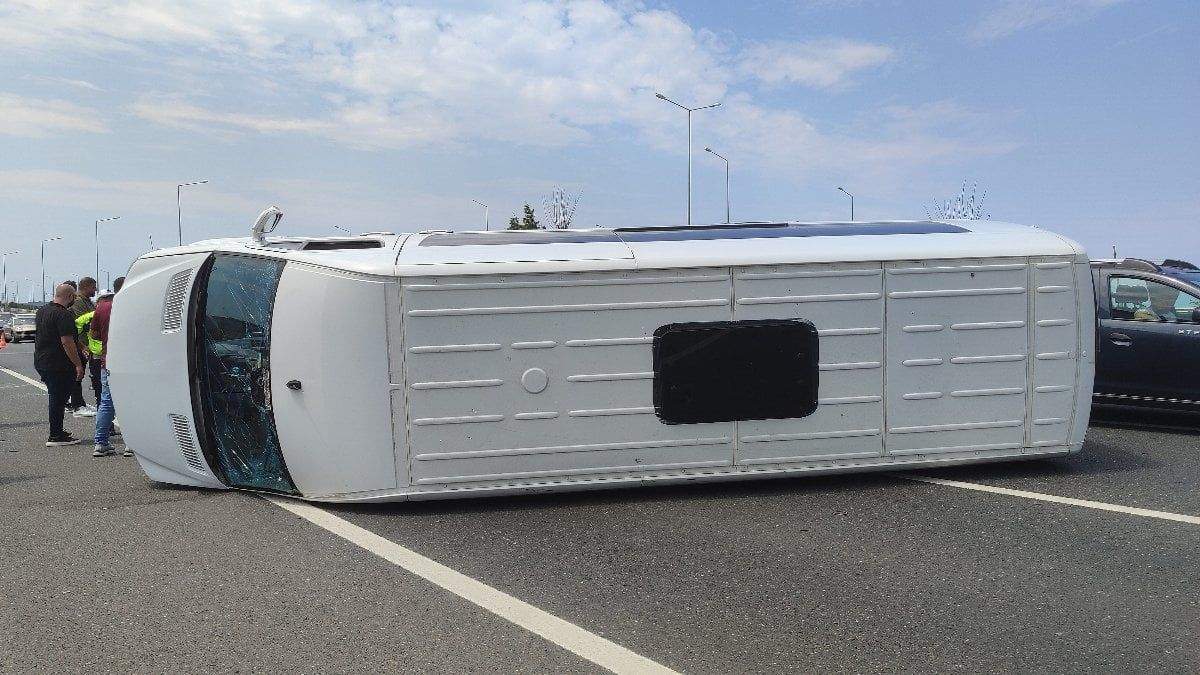 Arnavutköy Havalimanı Yolu'nda bariyerlere çarparak devrilen servis aracının şoförü, kazayı burnu bile kanamadan atlattı.