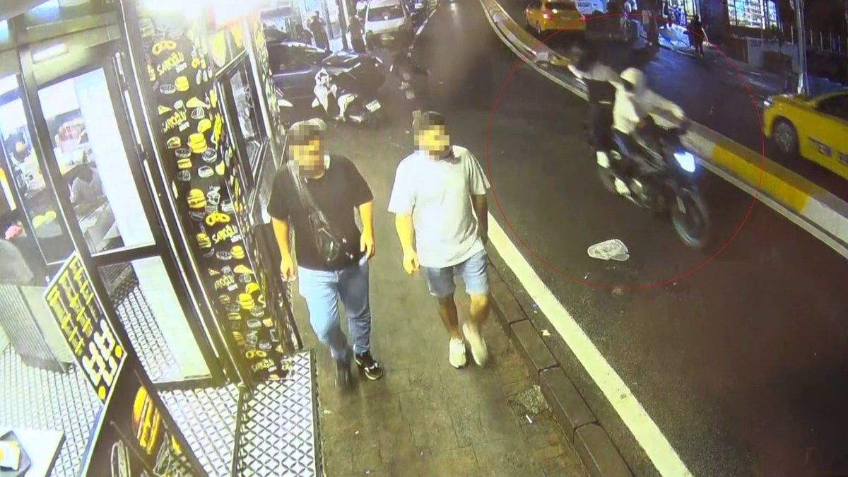Beyoğlu'nda bir büfenin önüne gelen motosikletli iki kişinin gerçekleştirdiği silahlı saldırı çevrede bulunan güvenlik kameraları tarafından anbean kaydedildi.