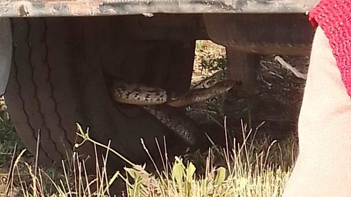 Merkeze bağlı Elmagöl köyünde ot taşıyan bir sürücü araba tekerleğin arasına sıkışmış 1 metre uzunluğundaki yılanı görünce neye uğradığını şaşırdı.