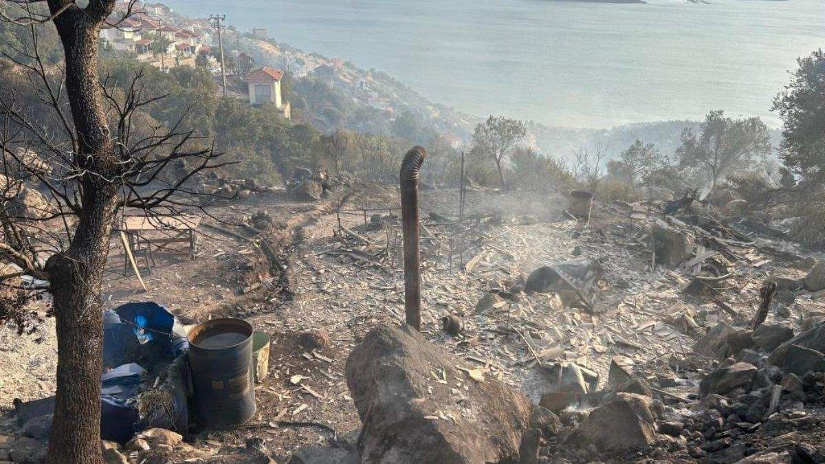 Dikili ilçesinde yerleşim yerlerine yaklaşan orman yangınında zeytin ağaçlarının da bulunduğu bahçedeki bir bağ evi yandı.