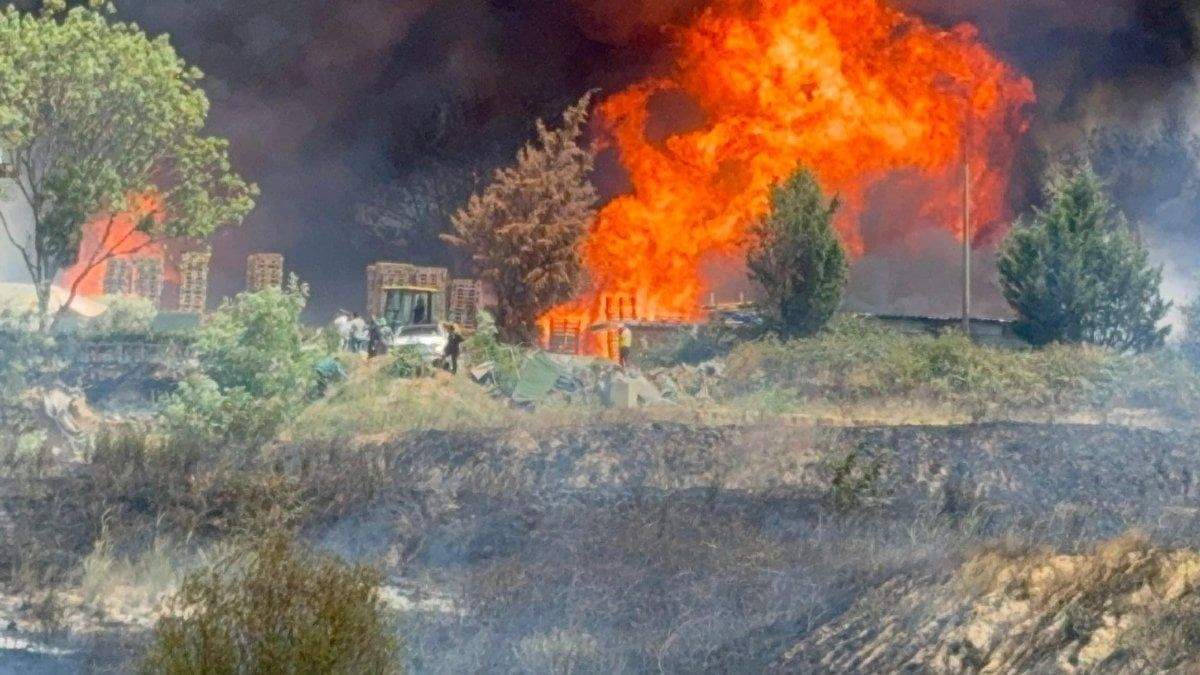 Tarlada çıkan anız yangınında alevler palet ve geri dönüşüm fabrikasına sıçrarken, bölgeye çok sayıda ekip sevk edildi.