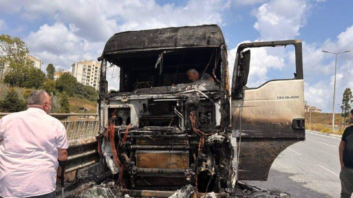 Seyir halindeyken lastiği patlayan hafriyat kamyonu, bariyerlere çarparak metrelerce sürüklendi ve çarpmanın etkisiyle de alevlere teslim oldu.