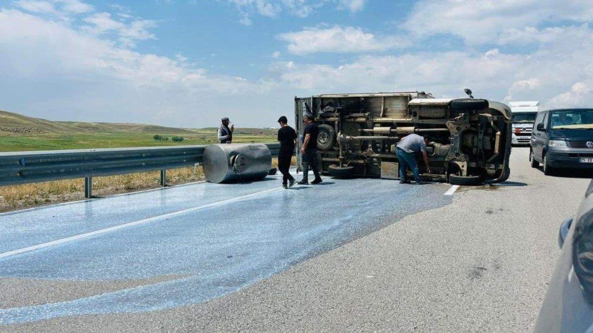 Erzurum'da süt tanklarının bulunduğu kamyonetin takla atması sonucu yüzlerce litre süt yola döküldü.