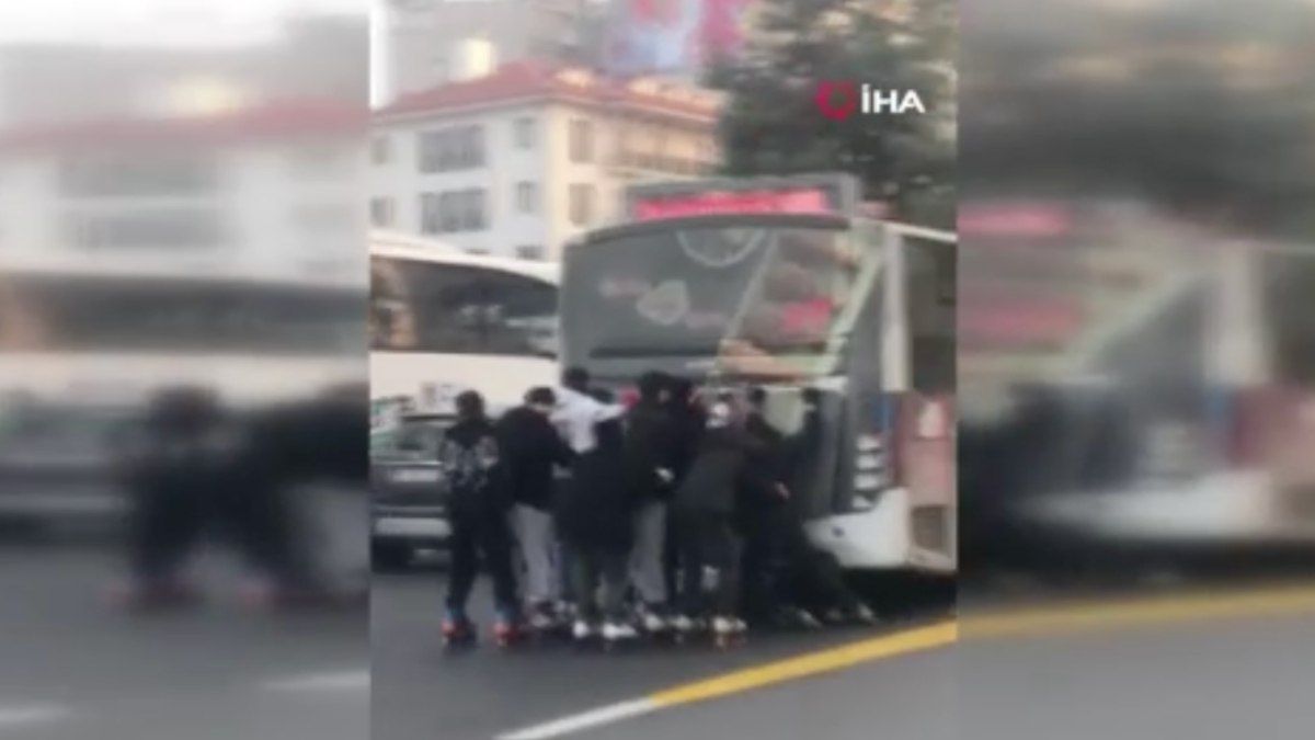 Seyir halindeki bir halk otobüsünün arkasına tutunarak ilerleyen patenli gençler hem diğer sürücülerin canlarını hem de kendi canlarını tehlikeye attı.…