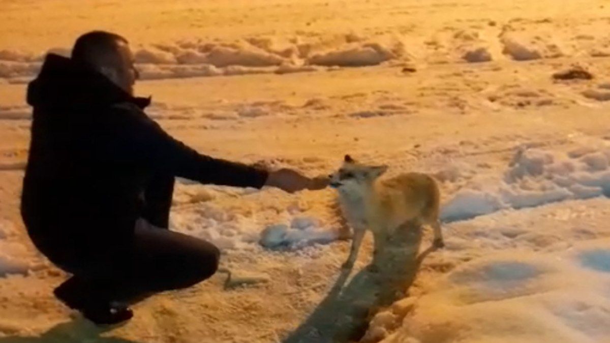 Aç kalarak köye inen tilkiyi evden aldığı ekmekle besleyen Celil Mercimek isimli vatandaş, o anları cep telefonu kamerası ile anbean…