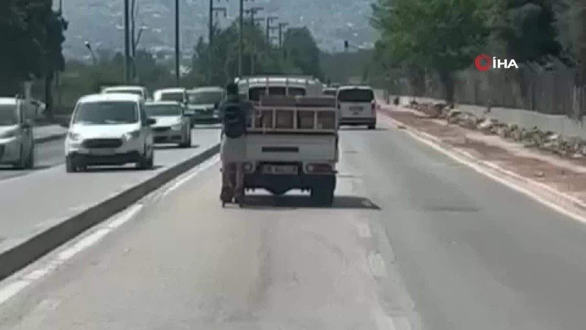 Bursa'da seyir halindeki kamyonetin kasasına tutunan bir genç, trafiği tehlikeye atarak paten kaydı. Genç, kendi canını hiçe sayarken, tehlikeli yolculuğu…